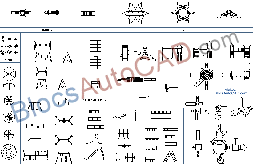 CLIMBING, NET, SQUARE JUNGLE JIM, SWINGS, SEE-SAWS, CAROUSEL, SLIDES, AGILITY (BLOCS AUTOCAD DWG) (BLOCS AUTOCAD DWG)