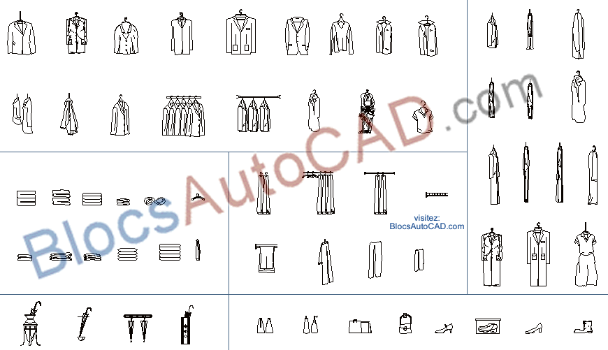 62 haute qualité autocad vêtements, Chaussures, Les serviettes, parapluies, pantalons, vestes, blazers et accessoires (Blocs autocad dwg)